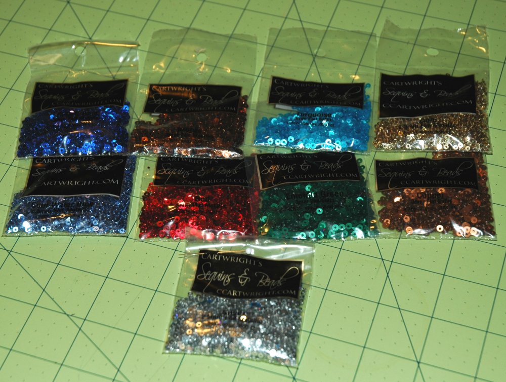 I'll bet you thought I was being a lazy blogger since the weather has decided to be a little nicer and I'm really wanting to be outside. Actually I have been working on the vest and do have some progress to show you. I received the teeny, tiny sequins (2.5mm), in the mail over the weekend. The site had a $12 minimum order so I ordered a bunch of different colors that I thought I might use over the course of a million years. LOL. Along with clothing, I thought to use some them on the doll party outfits I'll be making for our American Girl doll project. As you can see, I didn't get too carried away since I only purchased 9 colors. LOL. But they were only $1.15-$1.75 per package and you get anywhere from 2000 to 3000 sequins depending on the color you order. I ordered them from a little company in Arkansas called Cartwright's Sequins.
